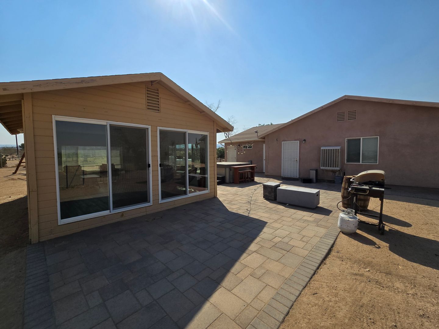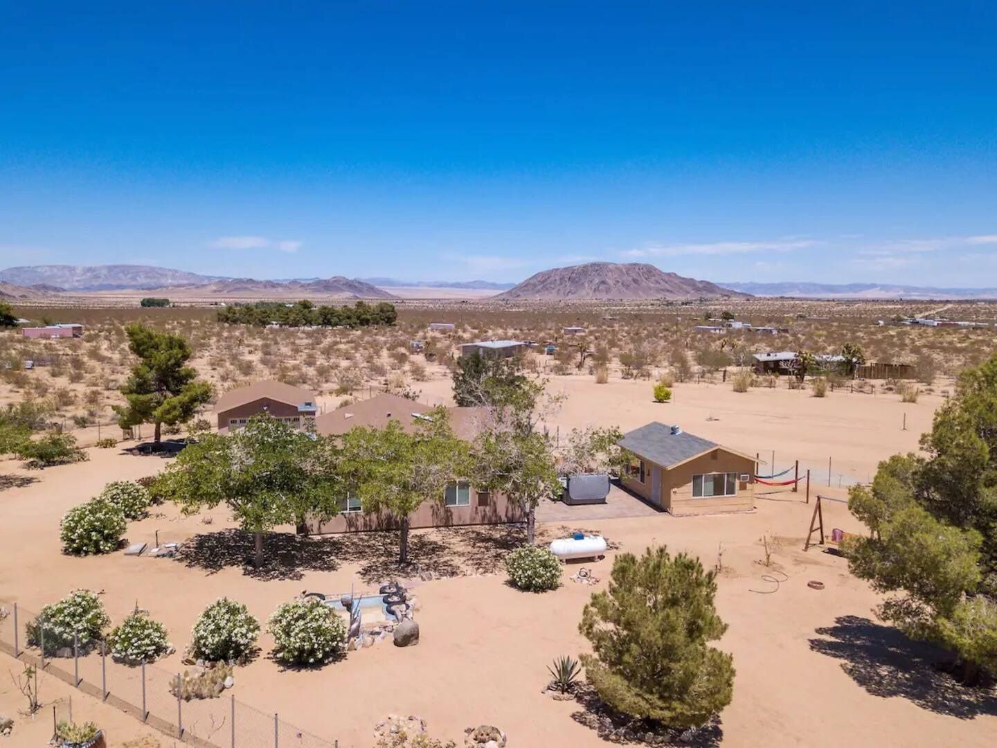 This property is a Must See! It is a FULLY FURNISHED 3 bedroom, 2 bath home on 2.5 Acres built in 2013. All you'll need to bring is your clothes and food. The kitchen has ample cabinet space and comes with a refrigerator, toaster, stove, and microwave. Each bedroom has a ceiling fan and its own air conditioner and comes with a queen size bed. The garage has been converted into a game room with a mini split for heating/cooling. It also has a laundry room with a washer, dryer, and utility sink. This place is great for entertaining, it comes equipped with a Jacuzzi, Firepit, BBQ, a sun room and is perfect for star gazing. You'll be close to the Joshua Tree National Park, Giant Rock, Integratron, and Pioneertown.